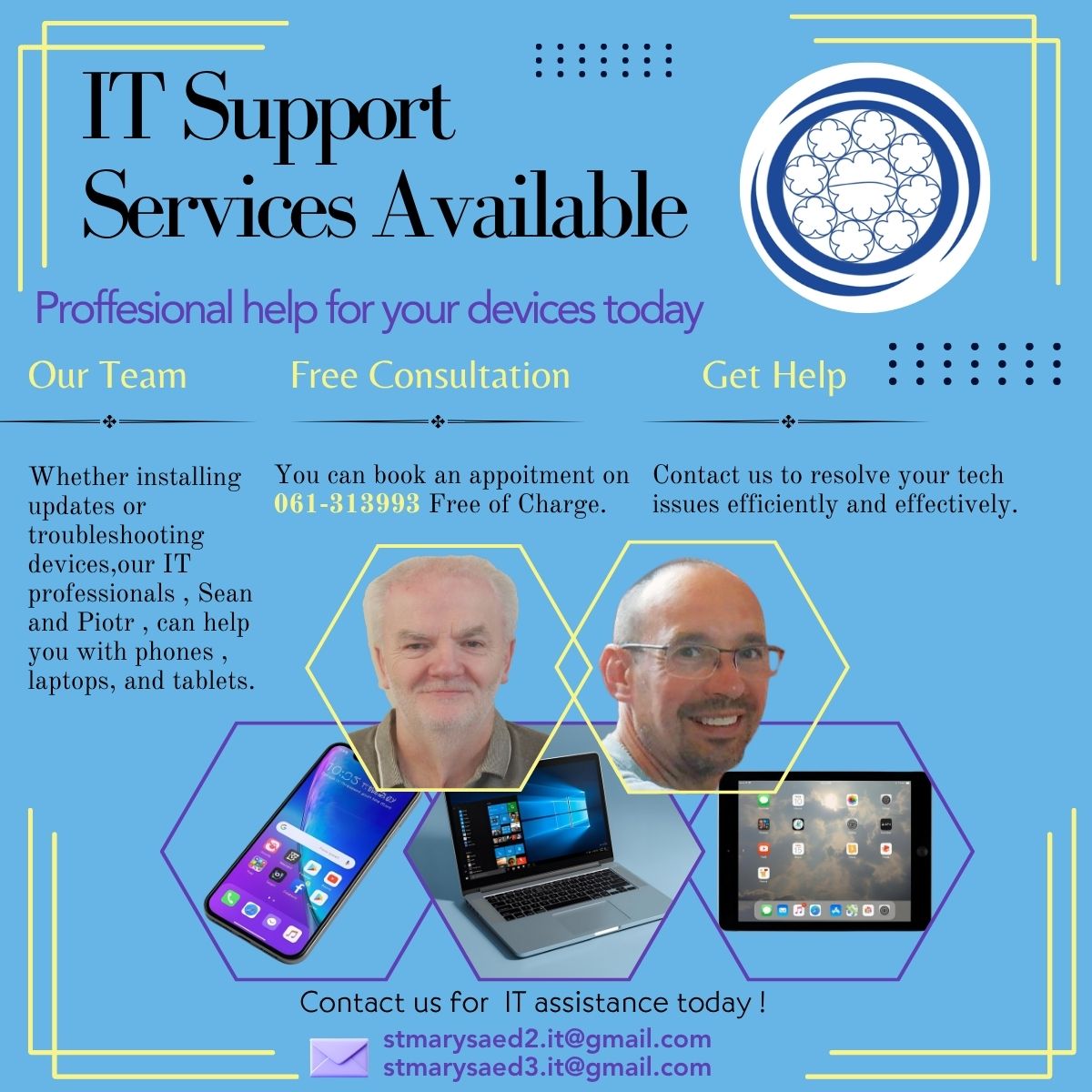 Whether installing updates or troubleshooting devices, out IT professionals, Sean and Piotr, can help you with phones, laptops, and tablets. You can book an appointment on 061-313993.